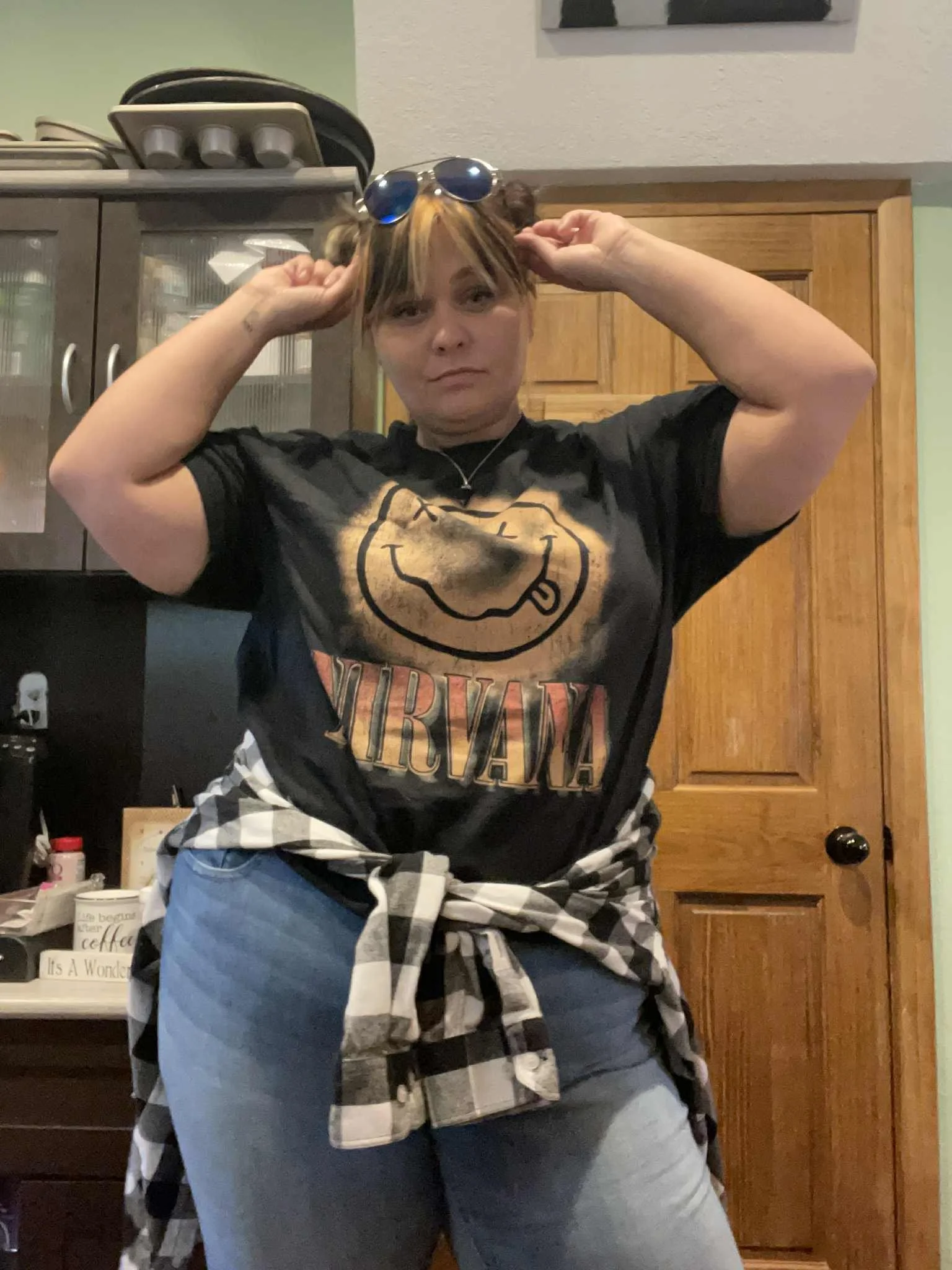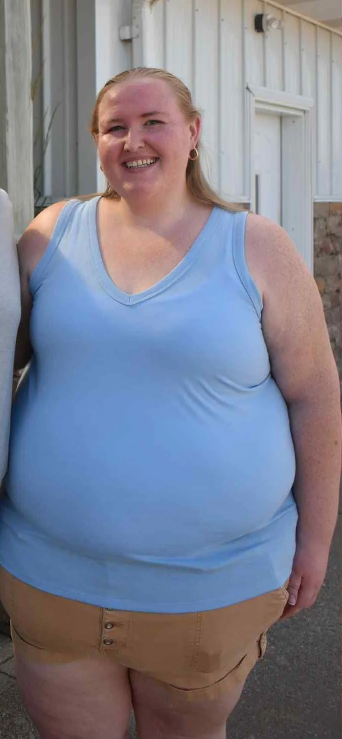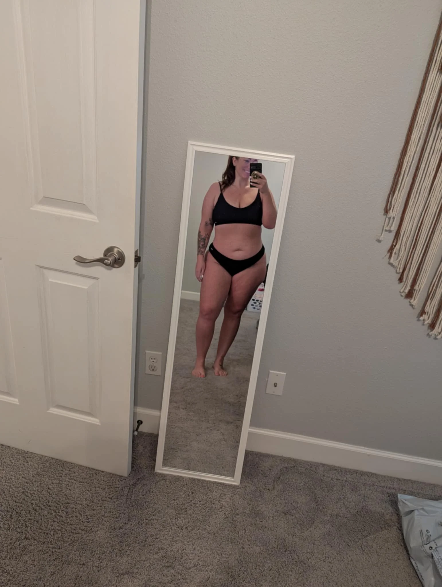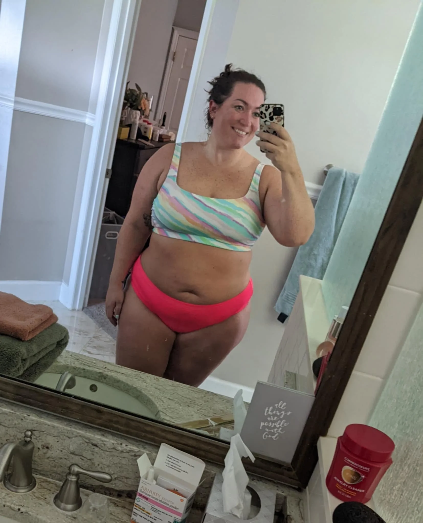 And from her sescond photoshoot! We don’t have many photos I can share, but her sizing during this time is: bottoms 1xl, 22 and tops Xl-2xl. (Link to her green outfit.)